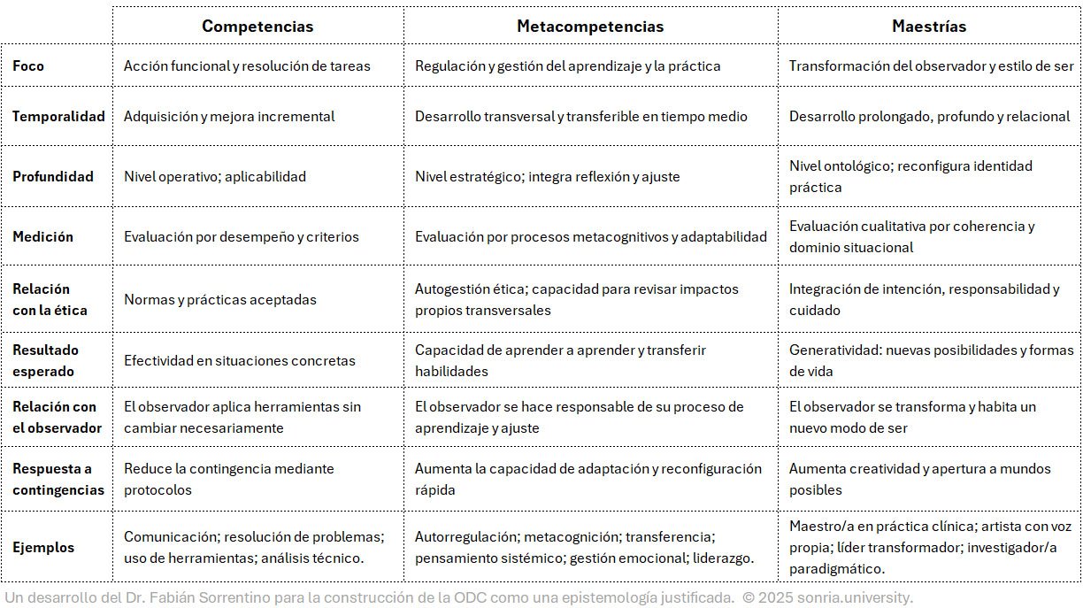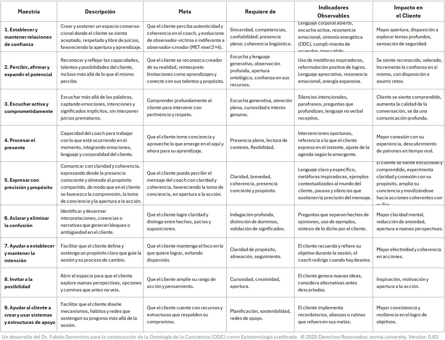 Las maestrías estructuran competencias, prácticas y distinciones ontológicasNo podemos observar algo para el cual no tengamos las distinciones. Por eso es que desde el Coaching Ontológico decimos que "Miramos con nuestros Ojos, pero Observamos con nuestra More que habilitan al coach para operar en las cinco dimensiones del observador (que concebimos en SONRIA): corporalLa evolución de los movimientos corporales especializados es de importancia obvia para la especie, y en los humanos esta adaptación se extiende al uso de herramientas. El movimie, emocionalDel latín emotĭo, que significa "movimiento o impulso", "aquello que te mueve hacia". Reacciones psico-fisiológicas que representan modos de adaptación a ciertos estímulos cua More, cognitivaEs aquello que pertenece o que está relacionado al conocimiento. Éste, a su vez, es el cúmulo de información que se dispone gracias a un proceso de aprendizaje o a la experienc More, cuántica y espiritualEl término espiritual (del latín spiritus, espíritu), es fruto de la suma de estos tres componentes latinos: • El sustantivo “spiritus”, que puede traducirse como “alma More.