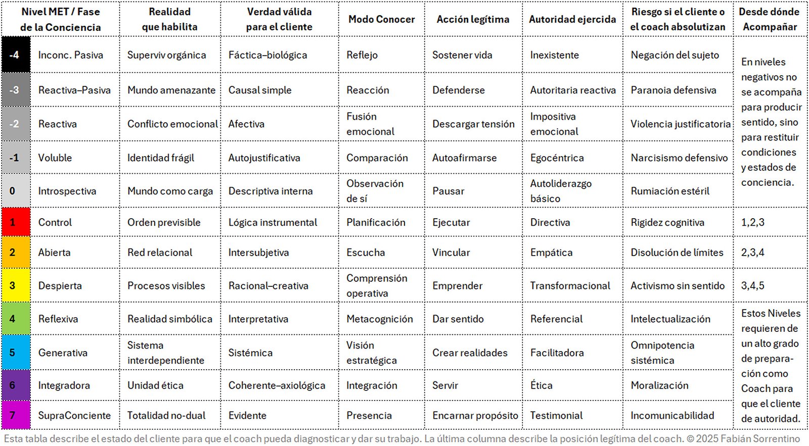 En los niveles negativos (-4 a -1) no existe aún un sujetoSegún la definición desarrollada en Wikipedia, en filosofía, el sujeto es el ser que tiene experiencias o se mantiene relacionado con otra entidad o con un objeto. De ahí la palabra subjetividad. Sujeto histórico es un concepto que define a un ente social que es... reflexivo disponible. Allí, pretenderLa primera definición de este término es desear efectivizar o conseguir una cosa. Normalmente es aspirar a hacer o que se realice algo y trabajar con esfuerzo para conseguir que eso se ocurra. Fundamentalmente se refiere a todo aquello que no es fácil o que quien habla... sentido, responsabilidad o compromiso genera negaciónMecanismo de defensa que consiste en enfrentarse a los conflictos negando su existencia o su relación o relevancia con el sujeto. Se rechazan aquellos aspectos de la realidad que se consideran desagradables. El individuo se enfrenta a conflictos emocionales y amenazas de origen interno o..., paranoiaEl comportamiento paranoico puede considerarse como un síndrome que nace de un sentimiento de inferioridad teniendo el valor de una protesta, compensación, revancha o castigo. La paranoia se define como una psicosis caracterizada por la sobre estima de sí, la desconfianza, la susceptibilidad, la rigidez..., violencia¿Qué es el Programa en Cárceles? Es el primer programa internacionalmente reconocido que provee soluciones innovadoras y efectivas para romper con los ciclos de violencia en la sociedad y reducir considerablemente el porcentaje del crimen. En este programa se dan diferentes cursos de yoga, respiración... emocionalDel latín emotĭo, que significa "movimiento o impulso", "aquello que te mueve hacia". Reacciones psico-fisiológicas que representan modos de adaptación a ciertos estímulos cuando percibimos un objeto, persona, lugar, suceso, o recuerdo importante. Psicológicamente, las emociones alteran la atención, hacen subir de rango ciertas conductas... o narcisismoAlude al mito de Narciso, amor a la imagen de sí mismo.1 El Narcisismo es el amor que dirige el sujeto a sí mismo tomado como objeto.2 Sigmund Freud lo introdujo en su obra, pero con una definición más difusa. Si bien se puede aludir... defensivo. En estos niveles, no se acompaña para producir transformación, sino para restituir condiciones mínimas de conciencia. El coach cuida el encuadre, deriva cuando corresponde y evita intervenir desde niveles superiores.