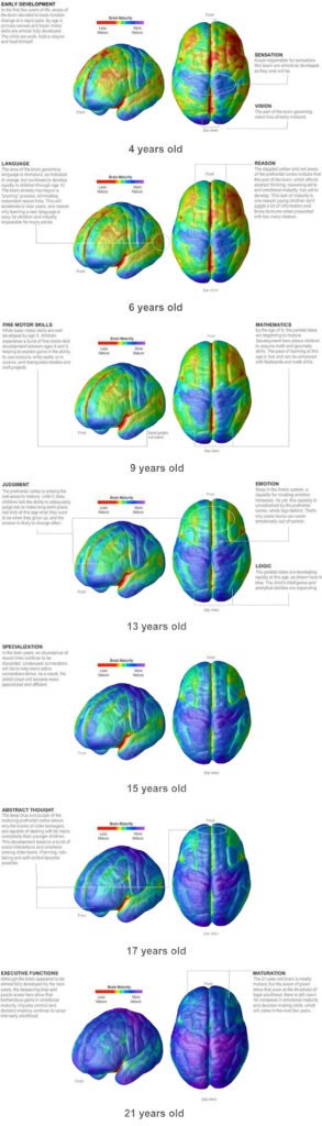 Etapa infantil: El cerebro crece rápidamente durante los primeros años de vida, aumentando su tamaño y su complejidad. Se forman miles de millones de neuronas y sinapsis, que son las conexiones entre ellas. El cerebro también se organiza en diferentes áreas funcionales, como las encargadas del lenguaje, la memoria o la atención. Algunas áreas maduran antes que otras, como las relacionadas con las funciones sensoriales y motoras. Otras áreas requieren más tiempo, como las implicadas en el razonamiento y la planificación.