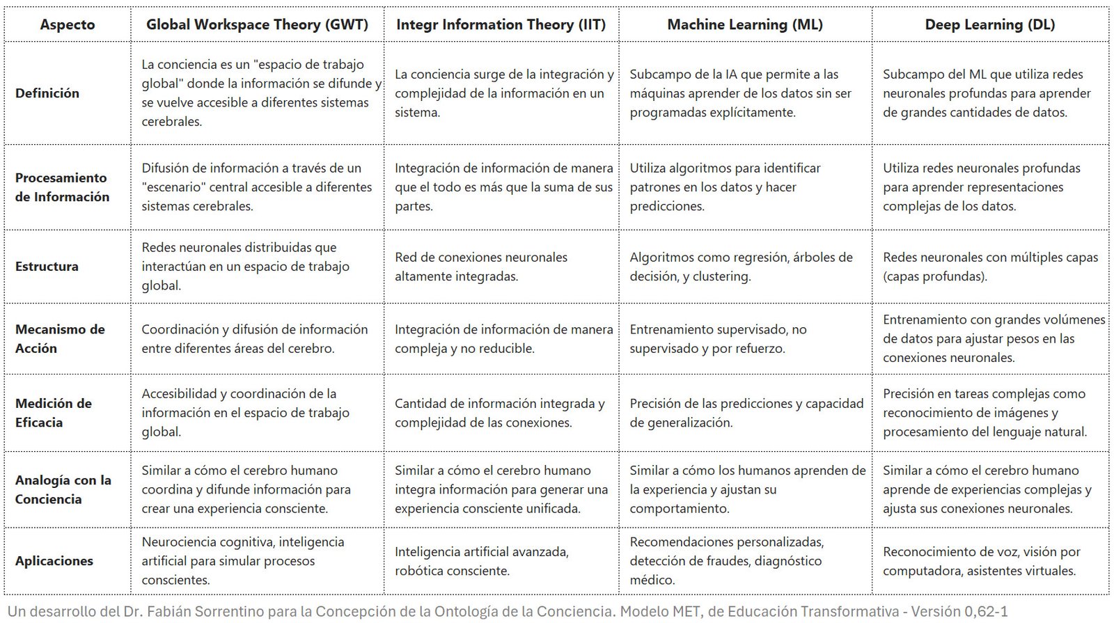 Las teorías de la conciencia y las técnicas de aprendizaje automático comparten similitudes en cómo procesan y manejan la información. GWT y Machine Learning se centran en la difusión y accesibilidad de la información, mientras que IIT y Deep Learning se enfocan en la integración y complejidad. Estas correspondencias reflejan cómo los conceptos de la neurociencia y la inteligencia artificial pueden inspirarse mutuamente para avanzar en la comprensión de la conciencia y el aprendizaje.