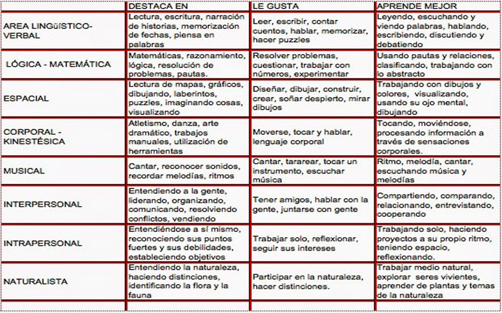 Para Gardner es evidente que, sabiendo lo que se sabe sobre estilos de aprendizajeProviene de la palabra “aprendiz”, que a su vez procede del bajo latín “aprehendivus”, y este de “apprĕhendĕre”, que significa aprender, y en donde el prefijo “ad More, tipos de inteligencia y estilos de enseñanza, es absurdo que se siga insistiendo en que todosDel latín totus y hace referencia a algo que se toma o se comprende enteramente. Por ejemplo: si en un salón hay ocho personas de sexo masculino y ninguna mujer, puede decirse qu More los estudiantes aprendan de la misma manera. La misma materiaSegún el diccionario José Ferrater Mora, el término griego ύλη (hule} se usó primariamente con los significados de "bosque", "tierra forestal", "madera" ("madera cortada" o More se podría presentar de formasSustantivo Femenino que significa Apariencia, figura, disposición, configuración, silueta o estructura externa y visible de algo. 1 Relacionados: aspecto, diseño, hechura, image More muy diversas que permitan al participante asimilarla partiendo de sus capacidades y aprovechando sus puntosRepresentación que carece de dimensión, constituyendo una situación extrema que no se da en la vida real. Así la punta de un lápiz, o un grano de arena, por mínima extensión fuertes.