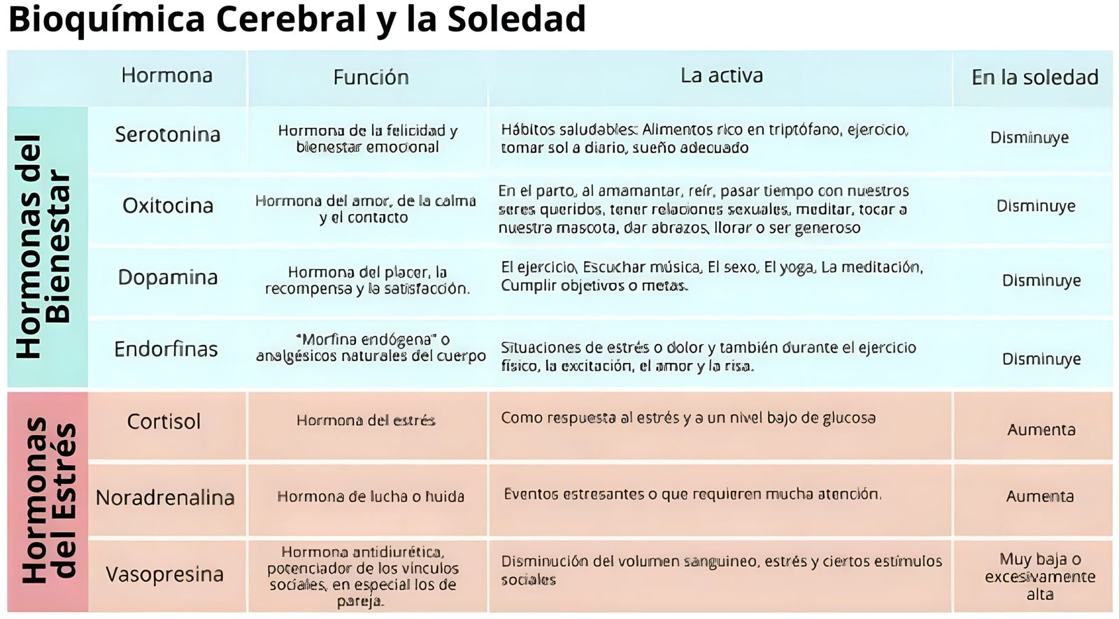 Cuando observamos las consecuencias de la soledad, es imposible no notar un elemento siempre presente y que puede ser estimado cuantitativamente. Este conector clave es el desequilibrio hormonal. Ahora bien, ¿es este desequilibrio el detonante o la consecuencia de la percepción de soledad?, ¿Cuál de ellos aparece primero? No es tan simple de responder.