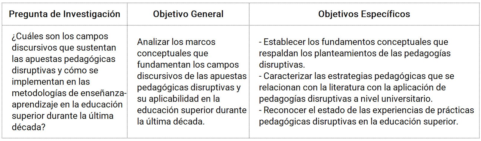 Los autores consideran que estos asuntos están articulados en las políticas de educación universitariaUna universidad es una entidad orgánica o sistema de unidades operativas de enseñanza superior, investigación y creación de cultura científica, humanística y artística. Se puede ubicar en uno o varios lugares llamados campus. Otorga grados académicos y títulos profesionales a nombre de la nación. Las universidades fueron creadas por monjes cristianos durante la Baja Edad Media. El término «universidad» se deriva del latín universitās magistrōrum et scholārium, que más o menos significa comunidad de profesores y académicos. Estas comunidades eran gremios medievales que recibieron sus derechos colectivos legales por las cartas emitidas por los príncipes, prelados, o las ciudades en los que se encontraban. Otras ideas centrales para la definición de la institución de la universidad era la noción de libertad académica y el otorgamiento de grados académicos. Muchas universidades se desarrollaron de las escuelas catedralicias y escuelas monásticas que se formaron desde el siglo VI d.C. Históricamente, la universidad medieval fue un producto típico de la Europa medieval y sus condiciones sociales, religiosas y políticas. Adoptado por todas otras regiones globales desde el comienzo de la Edad Moderna, hay que distinguirla de las antiguas instituciones de altos estudios de otras civilizaciones que no eran en la tradición de la universidad y al que este término solo se aplica retroactivamente y no en sentido estricto...., pero no se logran de manera clara. Por eso, esta investigaciónLa investigación es considerada una actividad orientada a la obtención de nuevos conocimientos y su aplicación para la solución a problemas o interrogantes de carácter científico; la investigación científica es el nombre general que obtiene el complejo proceso en el cual los avances científicos son el resultado de la aplicación del método científico para resolver problemas o tratar de explicar determinadas observaciones. De igual modo la investigación tecnológica emplea el conocimiento científico para el desarrollo de tecnologías blandas o duras, así como la investigación cultural, cuyo objeto de estudio es la cultura, además existe a su vez la investigación técnico-policial y la investigación detectivesca y policial e investigación educativa. Según el Objeto de Estudio Investigación básica: También es la llamada investigación fundamental o investigación pura. Busca acrecentar los conocimientos teóricos, sin interesarse directamente en sus posibles aplicaciones o consecuencias prácticas; es más formal y persigue las generalizaciones con vistas al desarrollo de teorías basadas en principios y leyes. Investigación aplicada: Es la utilización de los conocimientos en la práctica, para aplicarlos, en la mayoría de los casos, en provecho de la sociedad. Un ejemplo son los protocolos de investigación clínica. Investigación analítica: Es un procedimiento más complejo que la investigación descriptiva, y consiste fundamentalmente en establecer la... analiza: Los campos discursivosProveniente del griego, la palabra discurso implica en el lenguaje cotidiano, dar a conocer un mensaje razonado, en forma masiva y oral. El discurso se contiene en un texto que puede estar escrito y quien lo emite lo lee; o puede ser un discurso espontáneo e improvisado que surge directamente de la mente del hablante y no tiene soporte escrito. Los fines del discurso son múltiples; desde brindar información sobre un tema, argumentar una cuestión, alabar u homenajear a alguien, o recordar un acontecimiento relevante (como ocurre en los discursos emitidos en las fiestas patrias) o tratar de convencer, como ocurre con los discursos políticos. Todo discurso consta de un tema, una estructura y un estilo, según lo que intenta transmitir, y a las personas a quienes se dirige. Debe contener una organización, ser claro y coherente. Los discursos argumentativos y persuasivos implican tomar una postura, lo que conlleva a que tengan mayor subjetividad y valoración. https://youtu.be/AcL_kvK11b8 Más técnicamente la lingüística define como discurso a todo texto, oral o escrito, llamando género discursivo a cualquier dispositivo de comunicación generado en... de la pedagogía disruptiva, y tres categorías de análisis: