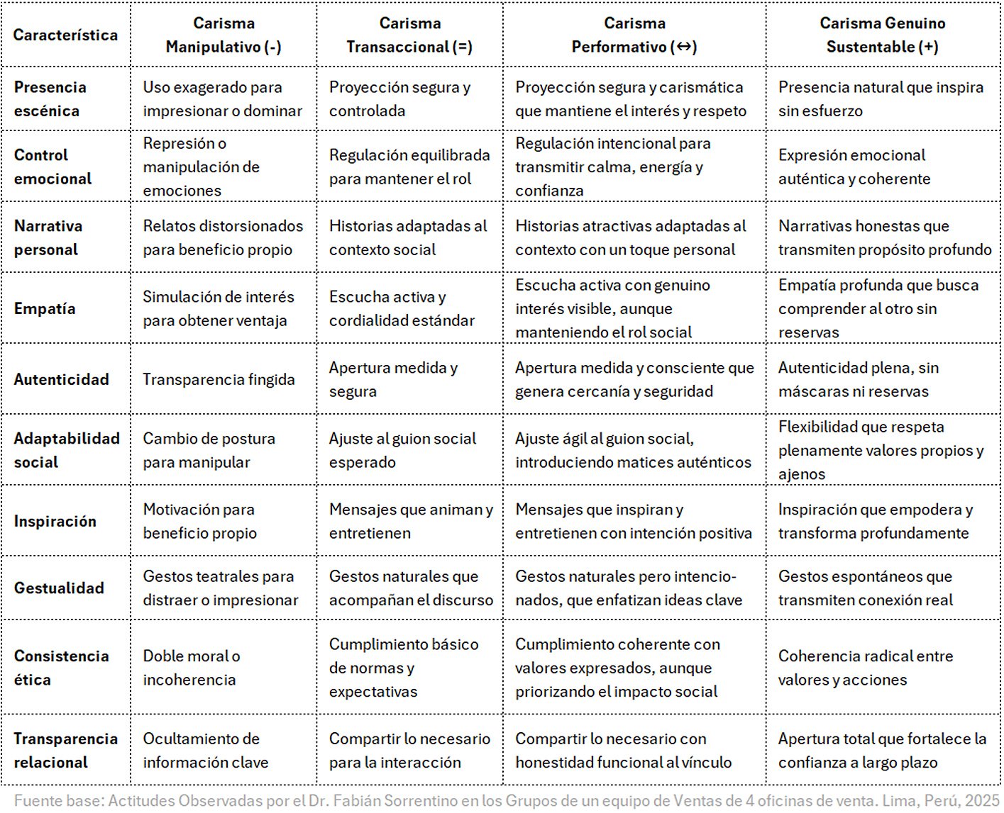El carismático performativo es uno de los 4 estilos de carisma. Comprendido como la personaEl concepto de persona (del latín persōna, ‘máscara del actor’, ‘personaje teatral’. Éste del etrusco φersu [phersu], y éste del griego πρóσωπον [prósôpon]) es un concepto principalmente filosófico, que expresa la singularidad de cada individuo de la especie humana en contraposición al concepto filosófico de «naturaleza humana» que expresa lo supuestamente común que hay en ellos. Sin embargo, en Ética y en Derecho no solo existen personas de la especie humana. ¿Cómo se concibe en la modernidad? El primer paso se da como consecuencia del nominalismo pero se observa ya con claridad en Descartes que no habla de persona sino de «yo». En la misma línea, para Locke persona ya no es un concepto metafísico pues no indica un ser o modo de ser, sino un estado en el que se encuentra a veces un ser. Por su parte, Kant denomina a la persona como aquel ser que es un fin en sí mismo. Si bien en Kant se vuelve a un concepto ontológico, no se trata de un ser abierto a la trascendencia, sino autónomo. Por su parte, el existencialismo vuelve a poner atención en la relevancia de este concepto. Para Kierkegaard, la persona no es solipsista /* Contexto filosófico */ más bien la salida... que combina presencia escénica y autenticidadRefiere a la correlación entre lo sentido interiormente y lo expresado exteriormente; pero no se refiere a una situación más compleja que es la posibilidad de distorsión interior donde lo sentido ya es consecuencia de un juicio, y no corresponde a nuestra auténtica esencia. No es extraño que las personas llegamos a perdernos sobre qué es lo auténtico en nosotros. Por ejemplo, podemos considerar que es auténtico criticar, pero nos autoengañamos diciendo que lo hacemos para que el otro se supere, en circunstancias que en realidad estamos siguiendo un impulso vindicativo, o porque con la crítica queremos cambiar la conducta del otro a fin de que realice la conducta que nosotros consideramos buena, o la que nos beneficia. Es valiosa la intención de autenticidad, pero sólo seremos auténticos con los otros si hemos clarificado la autenticidad de nuestra propia manifestación. La palabra auténtico viene del latín authenticus (original, auténtico, que responde a sí mismo). Pero el latín la tomó en préstamo del griego authentikós, que significaba primordial o también todo lo que se relaciona con un poder absoluto. Se deriva... estratégica para generar conexiónEn el contexto de la Ontología de la Conciencia, la “conexión” se refiere a la interrelación profunda y significativa entre diferentes aspectos de la existencia, tanto a nivel individual como colectivo. Aquí te explico algunos puntos clave sobre este concepto: Definición de Conexión • Interrelación de Seres y Entidades: La conexión implica una relación intrínseca entre todos los seres y entidades del universo. Esta interrelación no es solo física, sino también energética y espiritual. • Unidad y Totalidad: Desde esta perspectiva, todo está interconectado en una red de existencia donde cada parte influye y es influida por el todo. Las 4 Dimensiones de la Conexión La conexión esta mediada por el observador que somos del mundo y las distinciones que podemos concebir. • Relación con lo Divino, fuente de Sabiduría y Amor: La conexión con Dios es vista como la base de todas las demás conexiones. Esta relación espiritual proporciona un sentido de propósito y dirección en la vida. Conectar con Dios permite acceder a una fuente infinita de sabiduría, amor y compasión, que puede guiar nuestras acciones y decisiones diarias. •..., interés y confianza en contextosElementos extratextuales que influyen en el texto, tanto en su significado, como en su organización. Esos elementos son el espacio y el tiempo en que se realiza el proceso comunicacional, la identidad de las personas que intervienen en la comunicación, y su forma de pensar, sentir y actuar. Si emisor y receptor no comparten el mismo contexto, o sea, no poseen los mismos conocimientos e ideas sobre el objeto a comunicar, no lograrán comunicarse, pues el mensaje no será comprendido. Una misma expresión puede tener significados distintos dependiendo de cuándo, dónde y con qué intencionalidad sea expresada. Por ejemplo, manteca en algunos países significa un producto procesado a partir de grasa porcina y en otros, un producto lácteo. “Es de madera” es una expresión que puede significar el material con que algo está construido, o referirse a la poca agilidad o gracia de alguien en sus movimientos corporales. “Qué baile nos dieron! Puede querer referirse a una fiesta con danzas, o a que los hicieron esforzarse demasiado. La interpretación de las expresiones dependerá del contexto en que sean dichas. https://youtu.be/edwPqmMKfeM... socialesDel latín societas. Concepto polisémico que designa a un tipo particular de agrupación de individuos que se produce tanto entre los humanos (sociedad humana –o sociedades humanas, en plural–) como entre algunos animales (sociedades animales). En ambos casos, la relación que se establece entre los individuos supera la manera de transmisión genética e implica cierto grado de comunicación y cooperación, que en un nivel superior (cuando se produce la persistencia y transmisión generacional de conocimientos y comportamientos por el aprendizaje) puede calificarse como "cultura". Esa cultura en común representa un cierto folclore y criterios compartidos que condicionan sus costumbres y estilo de vida y que se relacionan entre sí en el marco de una comunidad. Aunque las sociedades más desarrolladas son las humanas (de cuyo estudio se encargan las ciencias sociales como la sociología y la antropología), también existen las sociedades animales (abordadas desde la sociobiología o la etología social). En este último sentido, por tant