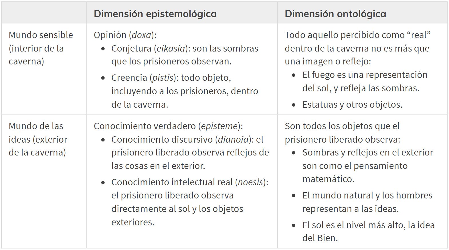 Cada elemento del mito de la caverna simboliza un nivel del ser y del conocimiento, dentro del dualismo ontológico y epistemológico de Platón. Precisamente, la alegoría de los hombres apresados dentro de una caverna (nivel inferior) y del hombre liberado en el exterior (nivel superior), funciona para explicar su concepción dualista del mundo.