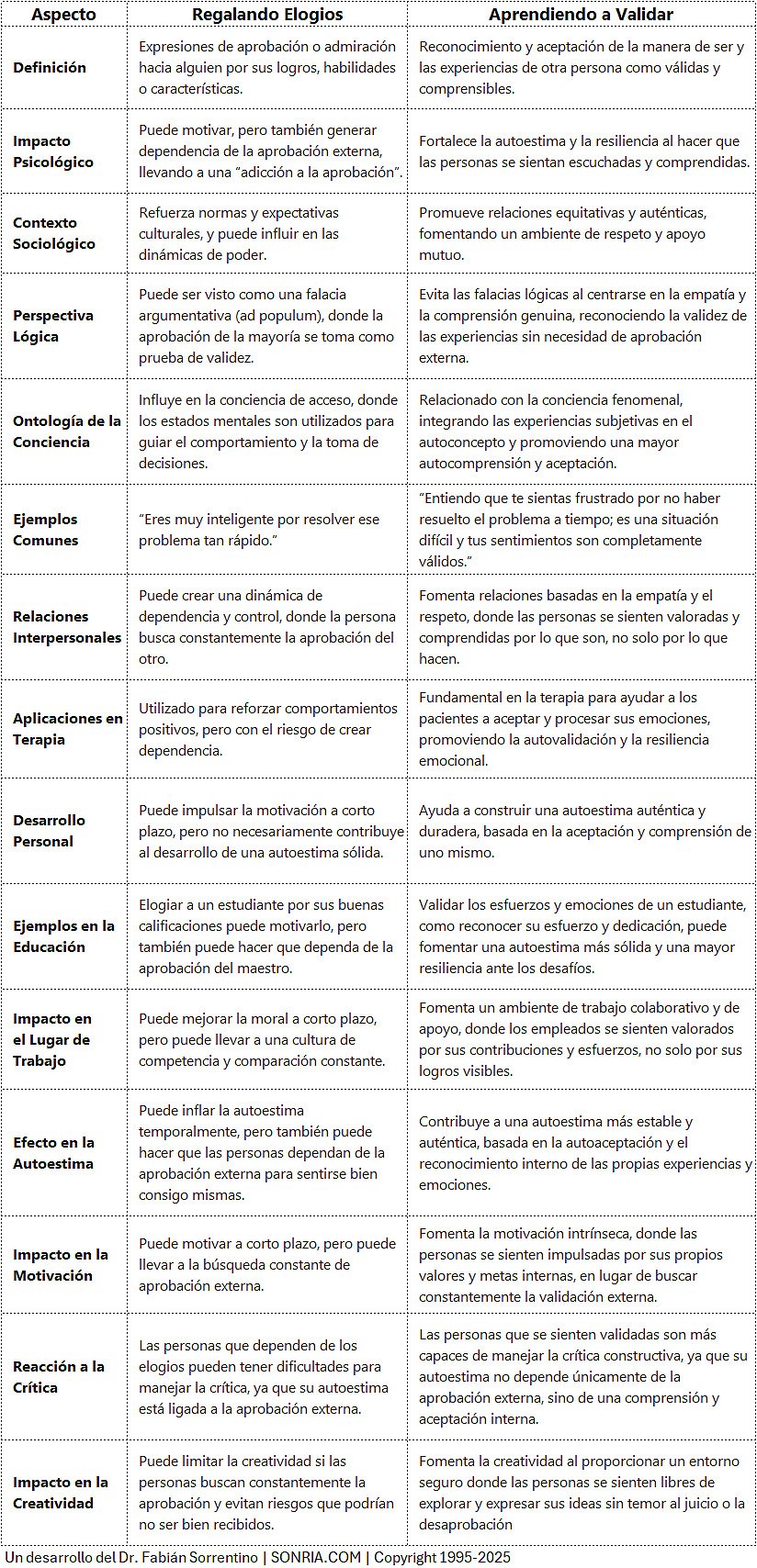 Elogiar implica reconocer y destacar cualidades(1) Definiciones tradicionales de la noción de cualidad. (2) Distinción entre varios aspectos de la cualidad y especialmente entre la cualidad y la no cualidad. (3) Posiciones fundamentales sobre el concepto de cualidad. Agregaremos unas palabras sobre (4) la cualidad en el juicio. Para la... o logros de una personaPersona. El individuo entendido como ser vivo dotado de conciencia. El término persona proviene del latín persōna, y éste probablemente del etrusco phersu (‘máscara del actor’, ‘personaje’), el cual —según el Diccionario de la lengua española— procede del griego πρóσωπον [prósôpon]. El concepto de persona..., mientras que validar se centra en aceptar y legitimar sentimientosPara explicar este concepto, tantas veces confundido con el de emociones, voy a hacer una distinción ontológica entre emociones y sentimientos. La emoción es definida por la neurociencia como la respuesta de nivel básico que crea reacciones bioquímicas en el cuerpo alterando el estado físico actual.... y experiencias. Esta distinciónNo podemos observar algo para el cual no tengamos las distinciones. Por eso es que desde el Coaching Ontológico decimos que "Miramos con nuestros Ojos, pero Observamos con nuestras Distinciones" El diccionario y el sentido común, nos dicen que el concepto “distinción” está asociado a... es crucial, ya que el uso adecuado de elogios y validaciones puede fomentar relaciones más saludables y contribuir al desarrollo personal.