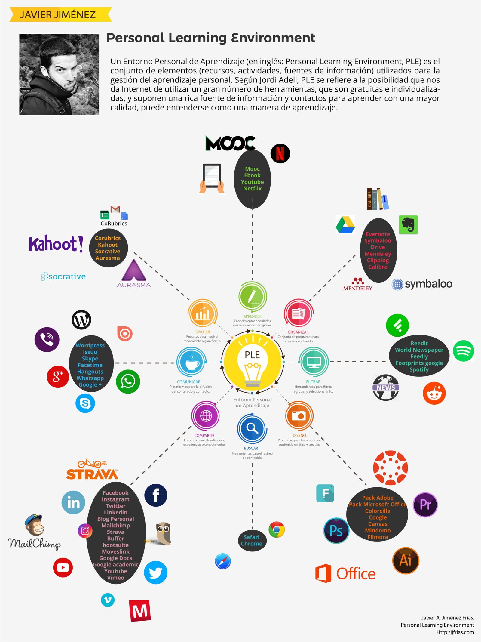 Adell matiza que un EVA O PLE no es una manera de enseñar, es más bienEl primer problema que plantea la noción de Bien, es un problema de vocabulario. Por un lado hay varios términos y varias expresiones cuyas significaciones son afines: 'el Bien', More «un enfoqueEnfoque es una palabra que se emplea en el idioma español para hacer referencia a la acción y la consecuencia de enfocar. Este verbo, a su vez, posee cuatro definiciones de acu del aprendizaje». Es decir, algo que nos ayuda a comprenderActo de comprender, que quiere decir a su vez abarcar, rodear, circunscribir algo. En Matemática se dice que un conjunto se define por comprensión, cuando se mencionan las caract More el modo en cómo aprendemos las personasEl concepto de persona (del latín persōna, ‘máscara del actor’, ‘personaje teatral’. Éste del etrusco φersu [phersu], y éste del griego πρóσωπον [pr More utilizando las tecnologías que se encuentran a nuestra disposición. «No es una aplicación, no es una plataforma, ni un nuevo tipo de softwareEquipo lógico o soporte de un sistema informático, que comprende el conjunto de los componentes lógicos necesarios que hacen posible la realización de tareas específicas, en c More que se puede instalar, el PLE es un enfoqueEnfoque es una palabra que se emplea en el idioma español para hacer referencia a la acción y la consecuencia de enfocar. Este verbo, a su vez, posee cuatro definiciones de acu pedagógico con unas enormes implicaciones en los procesos de aprendizajeProviene de la palabra “aprendiz”, que a su vez procede del bajo latín “aprehendivus”, y este de “apprĕhendĕre”, que significa aprender, y en donde el prefijo “ad More y con una base tecnológicaLa tecnología es la ciencia aplicada a la resolución de problemas concretos. Constituye un conjunto de conocimientos científicamente ordenados, que permiten diseñar y cre More evidente”.