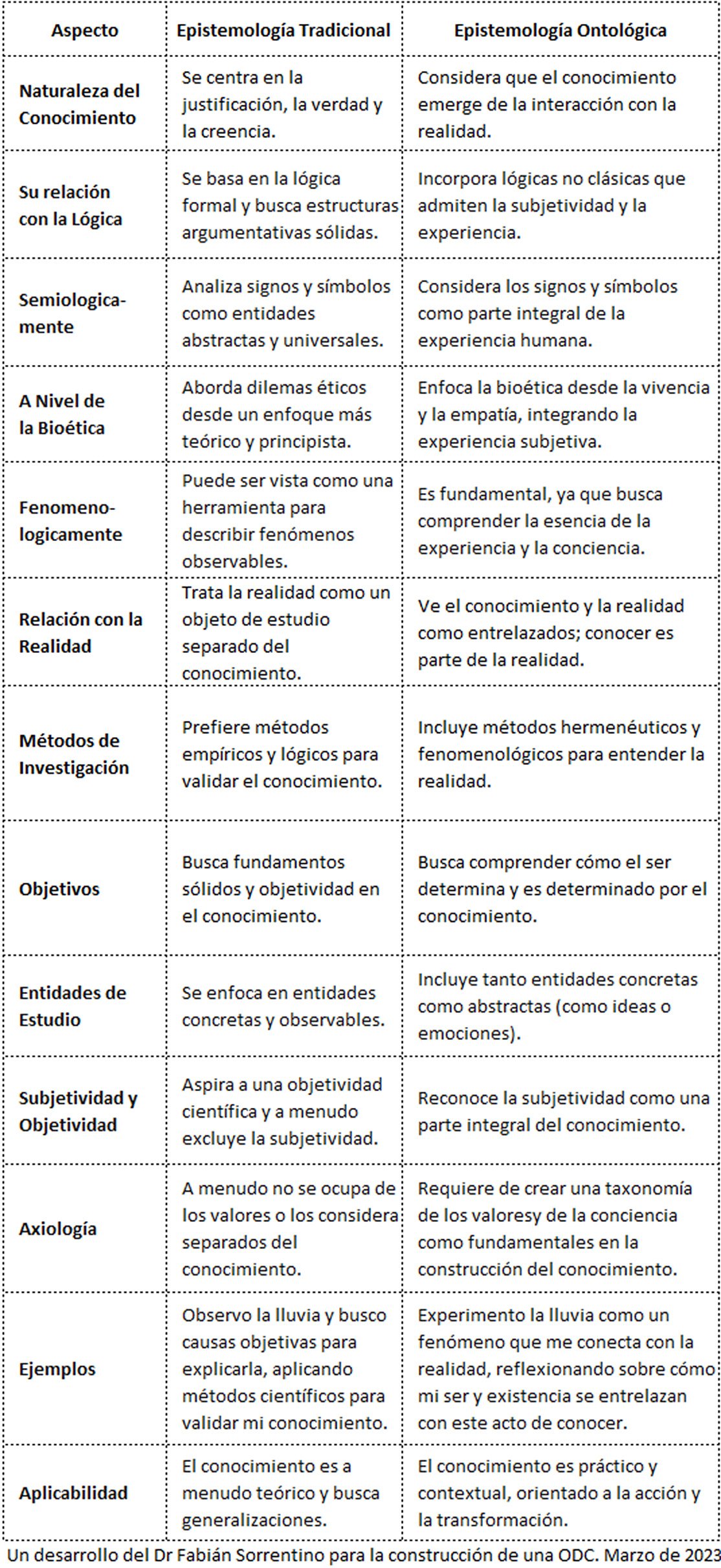 La epistemología ontológica se presenta como una alternativa a la epistemología tradicional y a la epistemología cristiana, ofreciendo un enfoqueEnfoque es una palabra que se emplea en el idioma español para hacer referencia a la acción y la consecuencia de enfocar. Este verbo, a su vez, posee cuatro definiciones de acuerdo a la información proporcionada por la Real Academia Española (RAE): lograr que la imagen de un objeto que se produce en el foco de una lente sea captada con claridad sobre un plano u objeto específico; conseguir en el visor de una cámara fotográfica que la imagen que se busca capturar quede en el centro del plano; realizar la proyección de un haz de luz o de un número específico de partículas sobre un punto en particular; y conducir la atención hacia un tema, cuestión o problema desde unos supuestos desarrollados con anticipación a fin de resolverlo de modo acertado. Cuerpo de conocimiento preexistente, junto con una interpretación de problemas, un conjunto de objetivos y una colección de métodos, un arquetipo que marca una conducción. Según el epistemólogo Mario Bunge, una manera de ver las cosas o las ideas y en consecuencia también de tratar su cosmovisión. El enfoque que más sentido nos hace a nosotros, para dar... más integrador y holístico del conocimientoConjunto de datos interrelacionados adquirido a través de la experiencia, del aprendizaje (a posteriori), o a través de introspección (a priori). Acción de conocer. Facultad de sentir. Entendimiento, inteligencia, razón natural. Sistema que explica las relaciones entre el pensamiento y los objetos y entre el hombre y el mundo. Sinónimos: Entendimiento, Inteligencia, Sabiduría. Conocimiento: acto de conocer y, al mismo tiempo, el resultado de este acto. Los conocimientos constituyen el conjunto del saber en un campo determinado. Se habla de teorias del conocimiento para evocar los problemas que se plantean durante la constitución del saber. En filosofia suele distinguirse a veces entre el conocimiento, que hace referencia a la teoria, y la acción, que se orienta más bien hacia la práctica. "La posesión de conocimiento, a no ser que vaya acompañada por una manifestación y una expresión en la acción, es como el amontonamiento de metales preciosos; una cosa vana y tonta. El conocimiento como la riqueza, esta destinado al uso. La ley del uso es universal, y aquel que la viola sufre en razón de su conflicto con las.... A diferencia de la epistemología tradicional, que se centra en la justificación y la verdadAbarca desde la honestidad, la buena fe y la sinceridad humana en general, hasta el acuerdo de los conocimientos con las cosas que se afirman como realidades: los hechos o la cosa en particular; así como la relación de los hechos o las cosas en su totalidad en la constitución del TODO, el Universo. Para el hebreo clásico el término "emuná" significa primariamente «confianza», «fidelidad». Las cosas son verdaderas cuando son «fiables», fieles porque cumplen lo que ofrecen. El término no tiene una única definición en la que estén de acuerdo la mayoría de los estudiosos y las teorías sobre la verdad continúan siendo ampliamente debatidas. Hay posiciones diferentes acerca de cuestiones como: ¿Qué es lo que constituye la verdad? ¿con qué criterio podemos identificarla y definirla? - Si el ser humano posee conocimientos innatos o sólo puede adquirirlos - Si existen las revelaciones o la verdad puede alcanzarse tan sólo mediante la experiencia, el entendimiento y la razón - Si la verdad es subjetiva u objetiva - Si la verdad es relativa o absoluta y hasta qué grado pueden... de las creenciasCreer es el estado de la mente en el que una persona supone verdadero el conocimiento o la experiencia que tiene acerca de un suceso o cosa; cuando se objetiva, el contenido de la creencia presenta una proposición lógica, y puede expresarse mediante un enunciado lingüístico como afirmación. Frank P. Ramsey propone una metáfora para indicar cómo podemos entender lo que son las creencias en su relación con lo real. Dice que vienen a ser como un mapa grabado en el sistema (en el ADN, o en determinados aprendizajes) que nos guían o mejor nos orientan en el mundo para encontrar la satisfacción de nuestras necesidades. Tales mapas no dicen “lo que son las cosas”, sino que muestran formas de conducta adecuadas a la satisfacción de las propias necesidades en el campo del mundo percibido en la experiencia. Origen de las Creencias Las fuentes de las que provienen las creencias son variadas: Externas: cuando se originan en explicaciones culturales recibidas para la interpretación y comprensión de ciertos fenómenos y la comprensión determinada de ciertos discursos. Internas: cuando surgen del propio..., y de la epistemología cristiana, que a menudo se basa en la revelación divina y la feLa fe (del latín fides) es la seguridad o confianza en una persona, cosa, deidad, opinión, doctrinas o enseñanzas de una religión. También puede definirse como la creencia que no está sustentada en pruebas, además de la seguridad, producto en algún grado de una promesa. La voz fides está acompañada en latín de una extensa familia léxica: fidere, confidere, fidelis, infidelis, perfidus, fiducia, confidens, etc. De ahí tomamos las palabras: ⃞ Fehaciente (fefaciente) - El que hace fe. ⃞ Fidelidad (fidelitas) - Lealtad de una persona a otra. ⃞ Fiel (fidelis) - Que guarda la lealtad y cumple sus obligaciones para con ella. ⃞ Confiar (confidere) - Poner fe globalmente en algo o alguien. ⃞ Confianza - Cualidad del que confía. ⃞ Confidencia (confidentia) - Puesta en común (con-) de algo que se da en lealtad a otro. ⃞ Confidente (confidentis) - Persona que escucha los secretos sin decírselo a los demás. ⃞ Desconfiar - Retirar (des-) a alguien la fe o confianza. ⃞ Infiel (infidelis) - Alguien que no demuestra lealtad o fe. ⃞ Infidelidad (infi