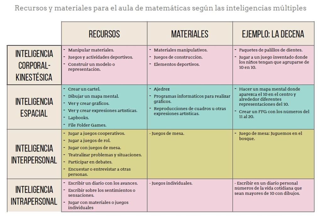 • usa materiales, estrategias, procedimientos y actividades comunes referidas a las distintas inteligencias, y