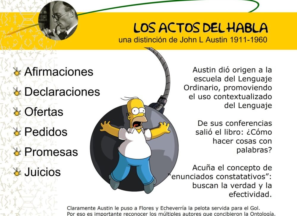 - John L. Austin(Lancaster, Reino Unido, (1911-1960) Objeto central de la filosofía es el estudio del lenguaje en su uso cotidiano. El lenguaje natural es su punto de partida, y no un lenguaje artificial e ideal como lo proponía el empirismo lógico. Austin viene de la corriente del “segundo” Wittgenstein (en Investigaciones filosóficas, de 1953) y otros autores, como Peter Strawson y Paul Grice. En lugar de interesarse excluyentemente por el modo en que el lenguaje puede transmitir o no la verdad en un discurso científico, estudia también el modo en que funciona el lenguaje en distintas situaciones cotidianas. Coincide, con estos autores, en proponer que referir y afirmar (por ejemplo: realizar enunciados acerca de estados de las cosas en el mundo) no es la única (ni siquiera la principal) función del lenguaje. Entre otras muchas, pueden citarse la pregunta, el pedido, la orden, la amenaza, la promesa. Wittgenstein se refiere a esas acciones como juegos del lenguaje; más popular en lingüística es el término propuesto por Austin y que luego continúa trabajando Searle: actos de habla. Su postura iba en contra de... (1911-1960) 1ro en hablar de los “actos del habla”