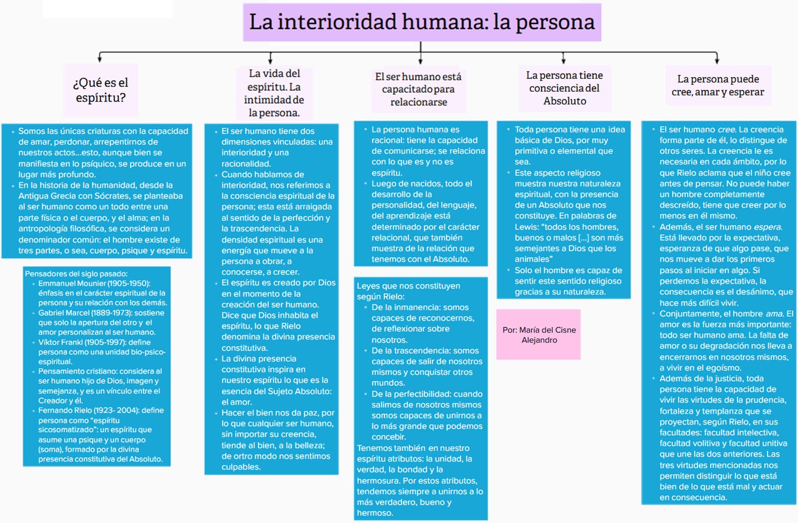El espíritu del ser humano es lo que lo hace diferente del resto de criaturas; esto lo abre a crecer en el Absoluto, a trascender. Solo nosotros dejamos rastros en la historia con nuestras obras, nuestras canciones, nuestra vida; así como desarrolla en otra cara de la historia, como la religión, con sus ritos, cultos y creencias. Nos lleva a preguntarnos, ¿qué es lo que hay en la persona que la faculta con estas capacidades y la dota de la apertura al Absoluto, de la relación con este y con los demás seres. Y lo sintetiza muy bien en este gráfico: