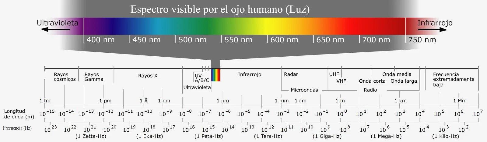 Dentro del espectro electromagnético se constituyen todos los posibles niveles de energía de la luz. Hablar de energía es equivalente a hablar de longitud de onda; por ello, el espectro electromagnético abarca todas las longitudes de onda que la luz puede tener. De todo el espectro, la porción que el ser humano es capaz de percibir es muy pequeña en comparación con todas las existentes. Esta región, denominada espectro visible, comprende longitudes de onda desde los 380 nm hasta los 780 nm (1 nm = 1 nanómetro = 0,000001 mm). La luz de cada una de estas longitudes de onda es percibida en el cerebro humano como un color diferente. Por eso, en la descomposición de la luz blanca en todas sus longitudes de onda, mediante un prisma o por la lluvia en el arco iris, el cerebro percibe todos los colores.