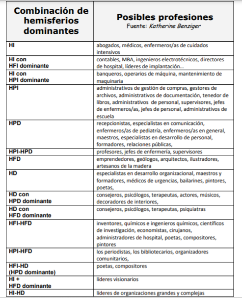 ¿Cuáles son sus dominancias y subdominancias cerebrales, y las actividades laborales en las que en principio estas pueden florecer?