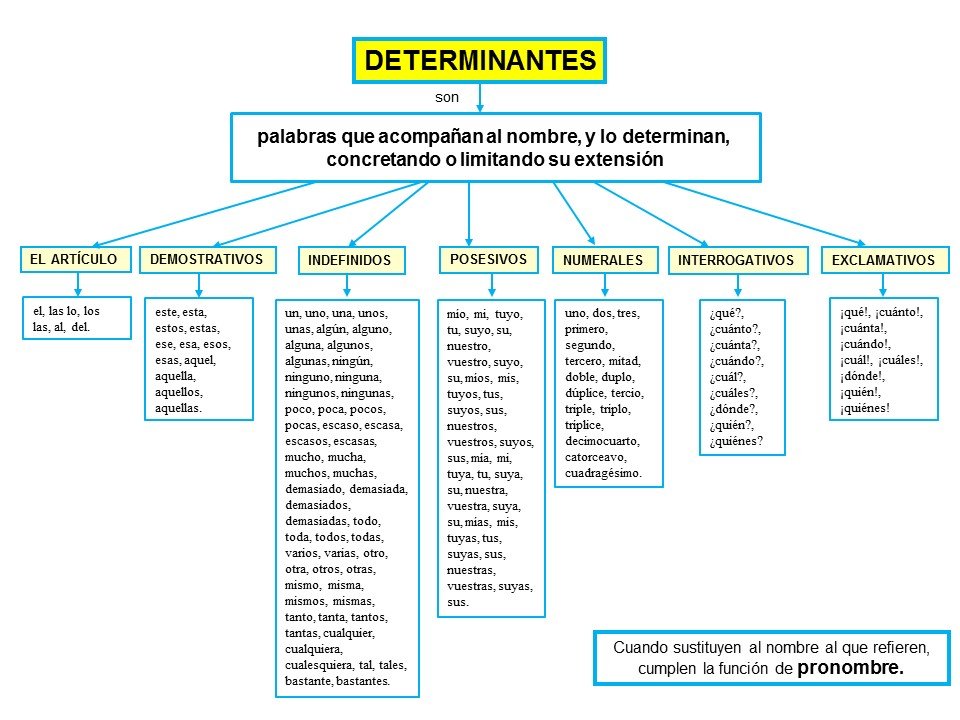 En español, la clase de determinantes incluye el artículo, los demostrativos, los posesivos y los cuantificadores (numerales e indefinidos), así como una serie de elementos léxicos que indican identidad o cantidad: otro, diversos, incontables.