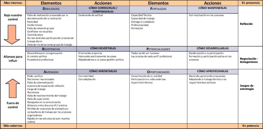 En esta nueva matriz se tiene la posibilidad de utilizar en una sola técnica la visualización de los aspectos positivos y negativos de la problemática o tema de estudio, junto a la formulación de las acciones que se podrían llevar a cabo, solos o con otros para que esos elementos identificados nos resulten favorables, ya sean debilidades, resistencias o amenazas, o para que los mantengamos reforcemos si son fortalezas, potencialidades u oportunidades.