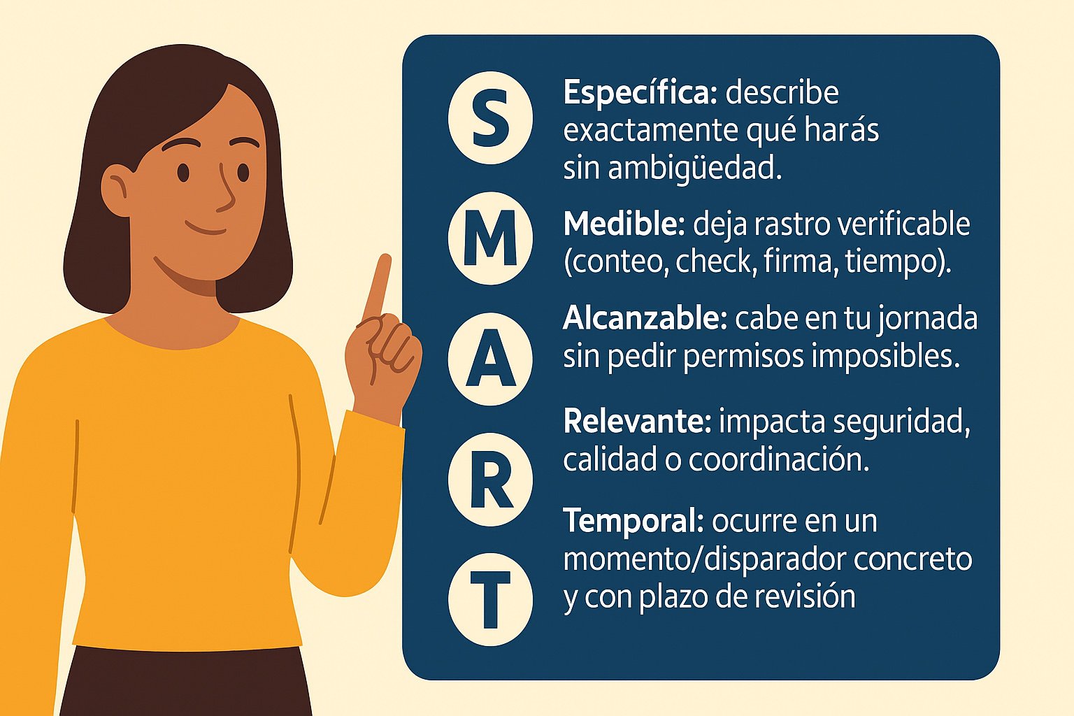 • Medible: deja rastro verificable (conteo, check, firma, tiempo).