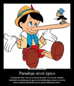 ¿Qué pasaría si Pinocho dijera: «Ahora mi nariz crecerá»?. Pinocho tendría que acompañarlo con una mentira para que lo qe ha dicho se convirtiera en cierto. Aunque no se sabe si al decir certezas la nariz le disminuye y contrarresta el efecto de las mentiras. Si no es así, es todo un invento de su creador, para tener siempre madera disponible, teniendo en cuenta que se le escape alguna mentirijilla.