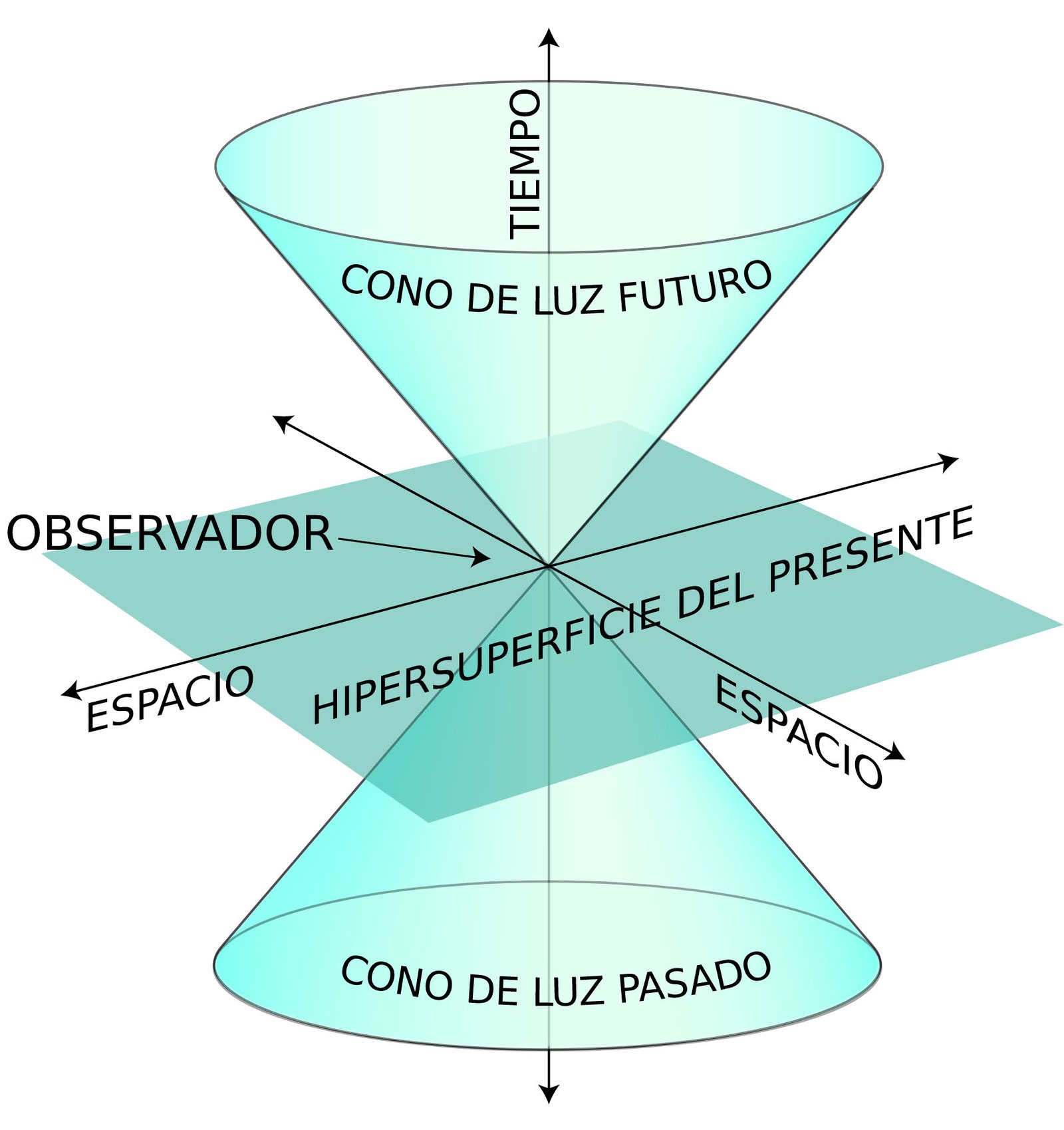 Conos de luz futuro y pasado de un evento cualquiera. El presente viene reflejado según el marco de la teoría clásica.