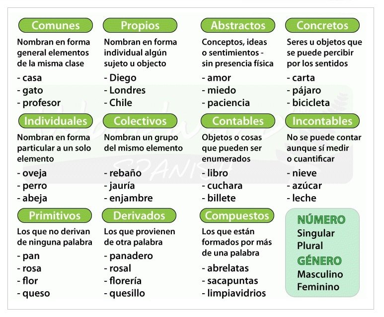 Palabras que designan cosas, personas, animales o lugares. Los que designan nombres propios, se llaman sustantivos propios, y se escriben con mayúscula, como por ejemplo, Pedro, Colita, la Tierra, Apolo 11, Océano Atlántico, México. Cuando se designan cosas en su generalidad, se llaman sustantivos comunes, y se escriben con minúscula, como auto, casa, hombre, niño, camino, etcétera.