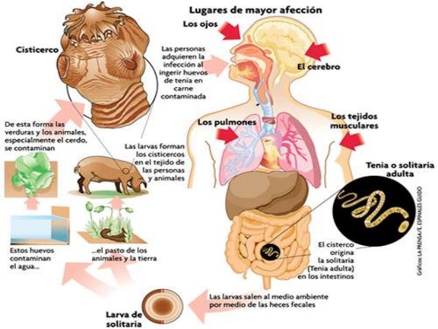 La contaminación con huevos de Taenia solium se conoce como cisticercosis y cuando es elevada pueden distribuirse por todo el cuerpo a través del sistema circulatorio y llegar al cerebro produciendo lesiones cerebrales y oculares provocando convulsiones y ceguera.