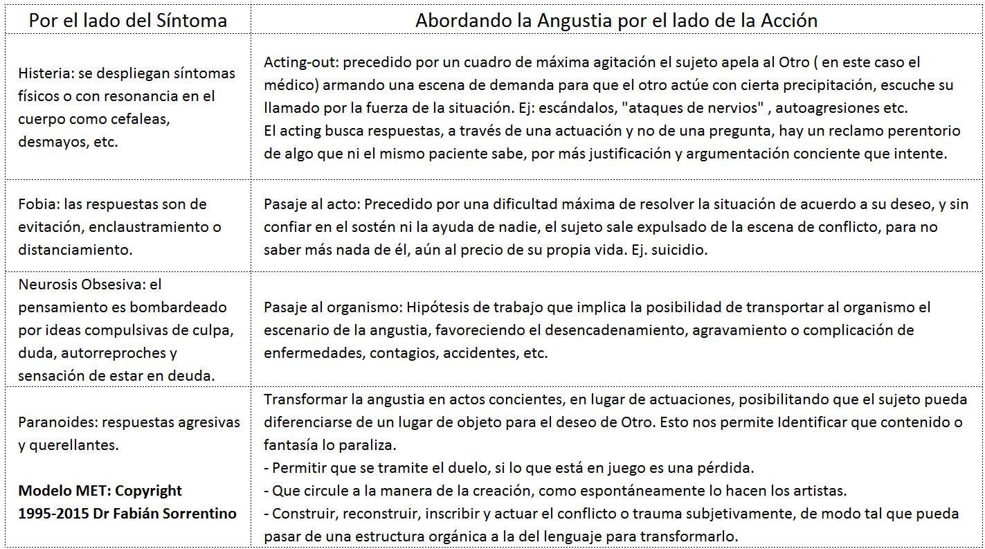 Un gran monto de angustiaLa angustia (etimología: del indoeuropeo anghu-, moderación, relacionado con la palabra alemana Angst) es un estado afectivo de carácter penoso que se caracteriza por aparecer c More no es tolerable en el tiempoSegún el desarrollo de la definición en Wikipedia, el tiempo es la magnitud física con la que medimos la duración o separación de acontecimientos sujetos a cambio, de los sist More, las formasSustantivo Femenino que significa Apariencia, figura, disposición, configuración, silueta o estructura externa y visible de algo. 1 Relacionados: aspecto, diseño, hechura, image More de salir de ella conllevan el peligro de las «soluciones desesperadas para lo que crece desesperadamente»…Lo que sigue, no es un catálogo de respuestas esperables, son algunas de las reacciones más frecuentes, y el sentido de describirlas, es el de otorgar racionalidadLa racionalidad es la capacidad que permite pensar, evaluar, entender y actuar de acuerdo a ciertos principios de mejora y consistencia, para satisfacer algún objetivo o finali More a ciertas conductasEs la manera de proceder que tienen las personas u organismos, en relación con su entorno o mundo de estímulos. El comportamiento puede ser consciente o inconsciente, voluntario reconocibles en los pacientesLa palabra paciente nos remite etimológicamente al latín “patiens”, participio del verbo “patior” que significa “sufrir”. Un paciente, como sustantivo, es un ser que, y que aparecen como fenómenos «anormales» o «accidentales», si no se los relaciona dentro del contexto que implica la situación de angustiaLa angustia (etimología: del indoeuropeo anghu-, moderación, relacionado con la palabra alemana Angst) es un estado afectivo de carácter penoso que se caracteriza por aparecer c More.