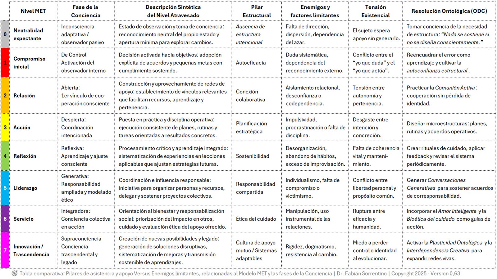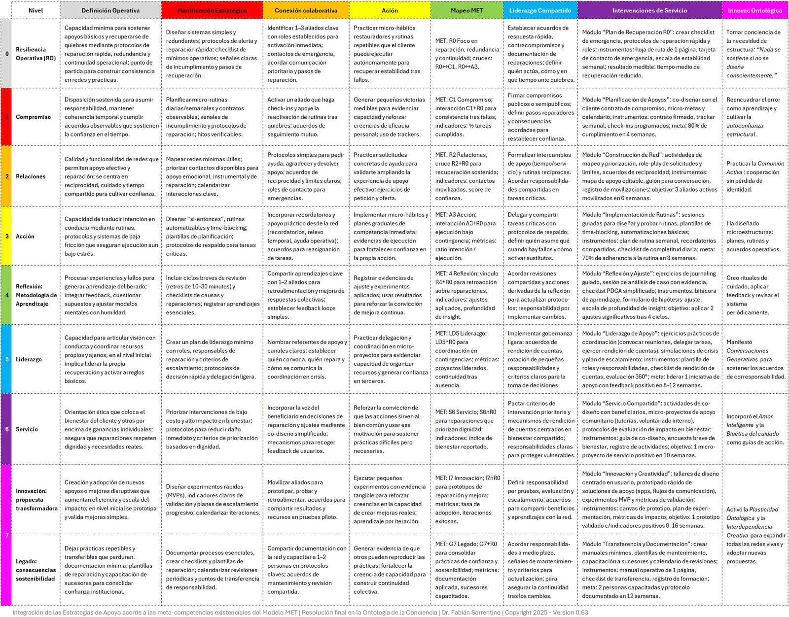 Se ha tomado como referencia principal el desarrollo de la Maestría 1 (“confianza”) adaptando la propuesta a la Maestría 9 y complementándola con lineamientos de la IAC, Los ejemplos prácticos de coaching nutricional pertenecen al institute.nutritionalcoaching.com. Estas fuentes proporcionan el sustento teórico y ejemplos aplicables para cada componente del marco ontológicoUn marco ontológico es un sistema formal para representar conocimiento, identificando conceptos, sus propiedades y las relaciones entre ellos. Sirve como un modelo de datos para estructurar información de manera coherente y reutilizable, permitiendo que las máquinas entiendan y procesen los datos de forma más inteligente. En filosofía, es el estudio de la existencia, mientras que en la informática y otros campos, es una forma de modelar y organizar el conocimiento sobre un dominio específico. Este marco parte de un conjunto de definiciones y relaciones entre los conceptos clave que se emplean para orientar y delimitar una investigación o un proyecto a realizar y a partir de allí este signifique un aporte a la humanidad. ¿Cuál es su propósito general? Un marco ontológico define qué elementos de la realidad se consideran reales y relevantes para un estudio, cómo se relacionan entre sí y qué niveles de existencia se toman en cuenta; aplicado al desarrollo de la conciencia humana, sirve para orientar qué aspectos de la experiencia, la identidad y la acción deben mapearse, medirse e intervenir para producir transformación sostenida. Vamos a analizarlo... presentado.