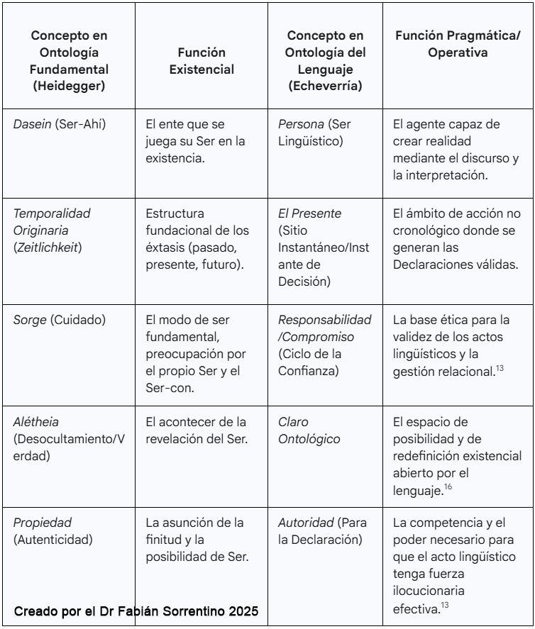 El presente documento establece las coordenadas conceptuales y la trayectoria intelectual en las que se funda la tesis central de un «Marco Ontológico Presente.» Este marco no opera como una mera descripción de la realidad, sino como un fundamento activo y transformador que postula que la existencia humana se constituye en el tiempo a través de la performatividad del lenguaje. La estructura teórica se articula en tres grandes pilares: la Ontología Fundamental de Martin Heidegger, la Filosofía del Lenguaje de J.L. Austin y John R. Searle, y la síntesis aplicada conocida como Ontología del Lenguaje de Rafael Echeverría.