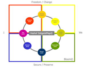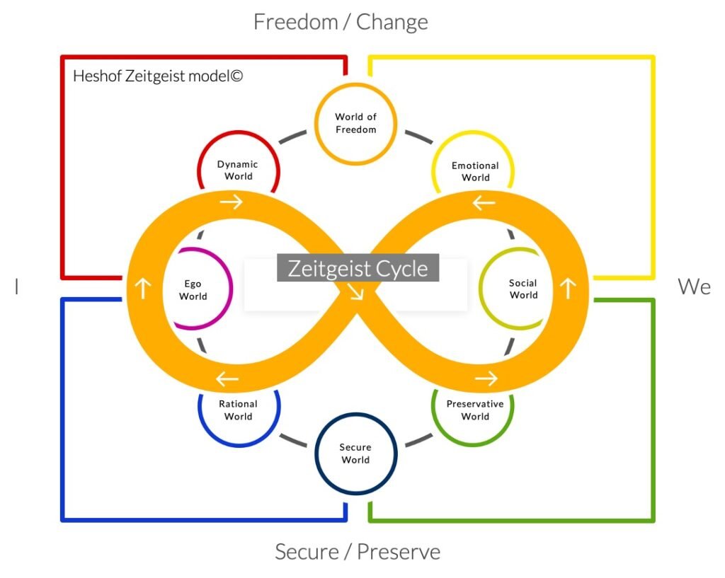 Este modelo se basa en la idea de que la sociedad se desarrolla en ciclos sucesivos de zeitgeist. La base de este modelo de dos ejes fue definida por Carl Jung y agrupada en cuatro colores. Peter Heshof ha colocado estos ocho ‘mundos’ en el modelo zeitgeist para profundizar la comprensiónActo de comprender, que quiere decir a su vez abarcar, rodear, circunscribir algo. En Matemática se dice que un conjunto se define por comprensión, cuando se mencionan las características comunes de sus elementos, sin nombrarlos uno por uno. El caso opuesto es por extensión. Por ejemplo, un conjunto está definido por comprensión cuando se dice que está integrado por los hijos del matrimonio del Sr. Juan Pérez y de la Sra. Rosa Fernández, y está definido por extensión cuando se diga que lo integran Marta, Josefina, Enrique, y Lucas Pérez Fernández. En la lógica aristotélica los conceptos pueden definirse por extensión o por comprensión. En el primer caso el concepto abarca todos los seres que tengan la misma cualidad. Por ejemplo el concepto de animal es extensivo a todos aquellos que reúnan las cualidades propias de los animales. En el segundo es el conjunto de cualidades que caracterizan al objeto del concepto, y sin los cuales no sería lo que es. En el mismo caso del concepto de animal, serían sus atributos esenciales, como los de ser vivo, con movilidad,... del consumidor. Estos ‘mundos’ representan las necesidades primarias de las personas. El modelo zeitgeist indica que en un período de 40 a 50 años los mismos cuadrantes de colorLos colores son la impresión producida por un tono de luz en los órganos visuales, o más exactamente, es una percepción visual que se genera en el cerebro de los humanos y otros animales al interpretar las señales nerviosas que le envían los fotorreceptores en la retina del ojo, que a su vez interpretan y distinguen las distintas longitudes de onda que captan de la parte visible del espectro electromagnético. Todo cuerpo iluminado absorbe una parte de las ondas electromagnéticas y refleja las restantes. Las ondas reflejadas son captadas por el ojo e interpretadas en el cerebro como distintos colores según las longitudes de ondas correspondientes. El ojo humano sólo percibe las longitudes de onda cuando la iluminación es abundante. Con poca luz se ve en blanco y negro. En la superposición de colores luz (denominada "síntesis aditiva de color") el color blanco resulta de la superposición de todos los colores, mientras que el negro es la ausencia de luz. En la mezcla de pigmentos (denominada "síntesis sustractiva de color"), trátese de pinturas, tintes, tintas o colorantes naturales para crear colores, el blanco solo se da si el pigmento o el soporte son de ese color, reflejando toda la luz blanca, mientras que el negro es resultado de la superposición completa de... y mundos de necesidades subyacentesLo primero que vamos a hacer es determinar el origen etimológico del término subyacente que ahora nos ocupa. En concreto, podemos indicar que deriva del latín, más exactamente de la palabra “subiacentis”, que puede traducirse como “el que está extendiendo por debajo” y que se halla conformada por tres componentes: -El prefijo “sub-”, que significa “debajo”. -El verbo “iacere”, que es equivalente a “estar tendido”. -El sufijo “-nte”, que lo que viene a hacer es indicar al “agente”. Se trata de un adjetivo que refiere a aquello que subyace. El verbo subyacer, por su parte, se vincula a permanecer oculto o debajo de alguna cosa. Por ejemplo: “Hay una violencia subyacente en todos los grupos sociales que, cada tanto, emerge a modo de estallido”, “Los científicos no encuentran una causa subyacente que explique el nuevo brote de la enfermedad”, “Con sus declaraciones, el jugador evidenció su voluntad subyacente de quedarse en el club”. Supongamos que un periodista está realizando una investigación sobre el narcotráfico en un determinado barrio. Dicho periodista comienza a entrevistar a los vecinos, pero sólo recibe respuestas evasivas y vaguedades e incluso se encuentra con gente que... son dominantes según un ciclo fijo.