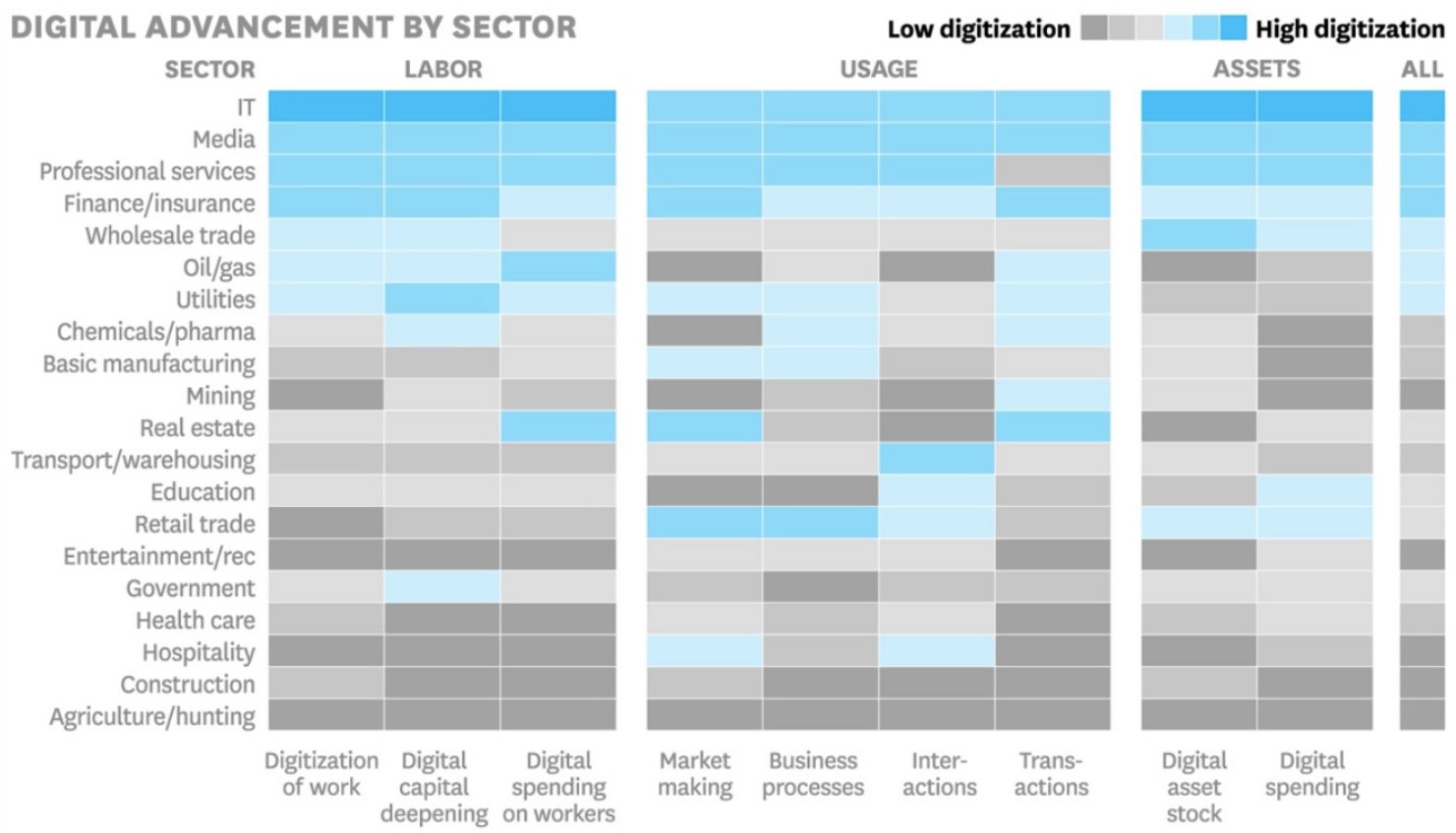 La diferencia es enorme, ya que las empresas de los principales sectores tienen 13 veces más mano de obra digital que sus competidores. La participación de los trabajadores digitales puede ser volátil en las industrias que se quedan atrás. Algunas organizaciones han progresado en ciertas áreas, pero aún tienen que abordar las tareas críticas que deben realizar sus empleados. Por ejemplo, muchas organizaciones de atención médica utilizan tecnología muy avanzada para el diagnóstico y el tratamiento, pero la mayoría del personal utiliza herramientas muy rudimentarias o no utiliza ninguna tecnología. Por ejemplo, menos del 20% de los proveedores de atención médica y sus pagos se realizan digitalmente.