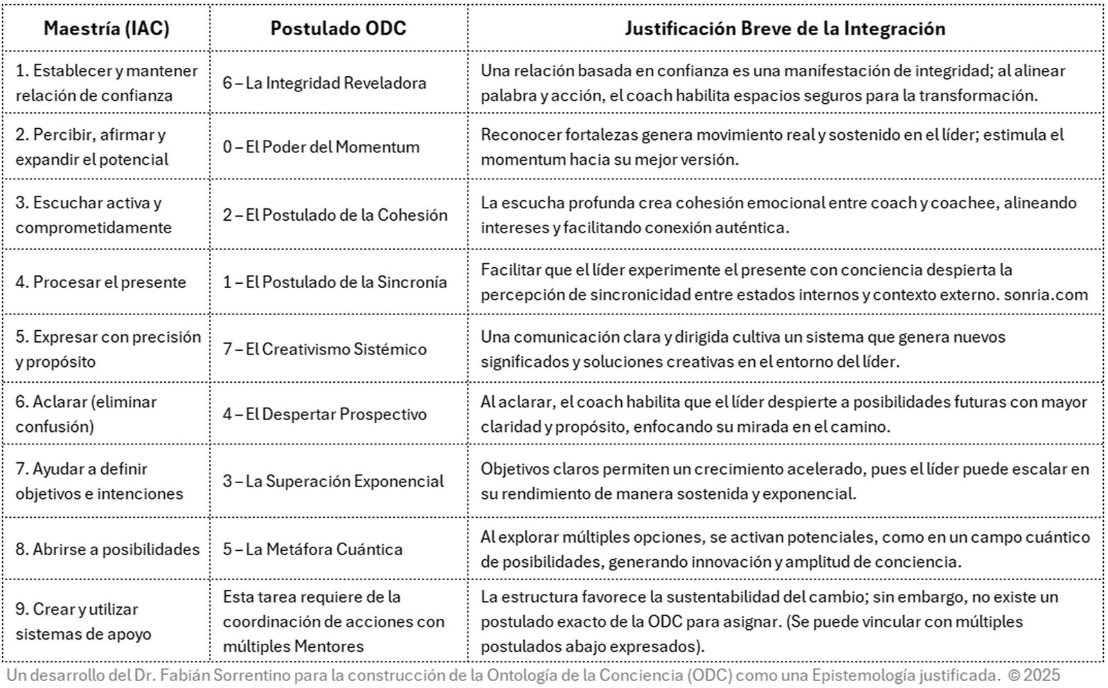 Flexibilidad interpretativa: La vinculación propuesta busca generar coherencia conceptual, pero puede adaptarse acorde al desarrollo de la ODC o de las Maestrías de Coaching en el caso que aparezcan matices específicos que requieran una correspondencia diferente.