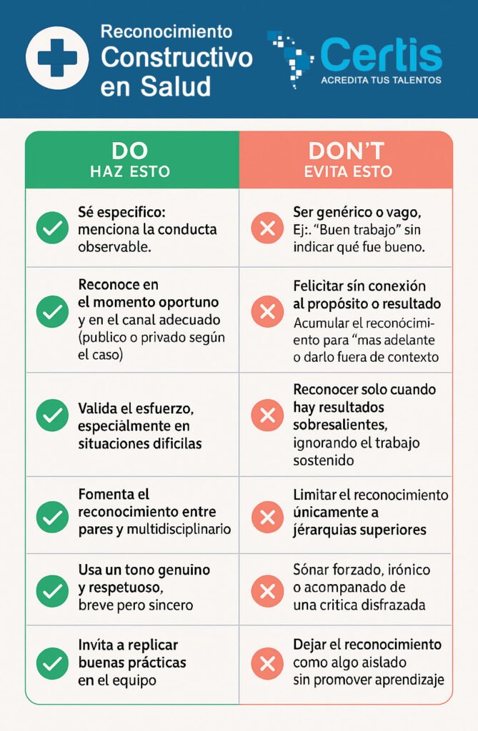 El reconocimiento constructivo es la habilidad de destacar de forma específica, oportuna y genuina aquellos comportamientos, actitudes o logros que fortalecen las buenas prácticas y la motivación del equipo y de los pacientes.