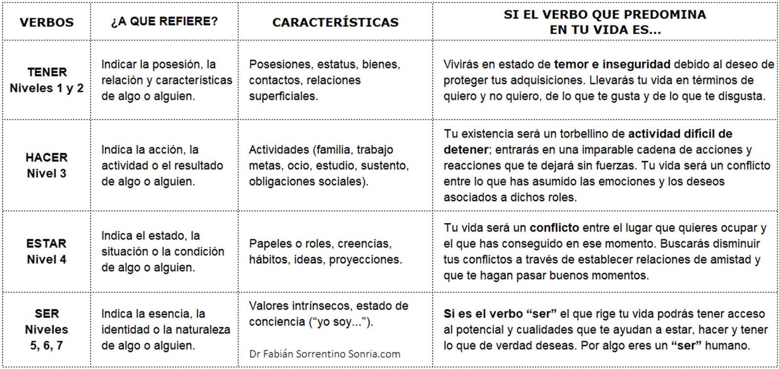 2 – ¿En qué dinámicasCuando hablamos de dinámicas, áreas en las que se desarrolla la vida, en Ontología del Lenguaje nos referimos algunos términos como estos: Corporalidad, Emociones y Lingüísti More de tu vida te relacionas con tu serAtributo filosófico griego que se le adjudica a una entidad capaz de definirse a sí misma frente a un medio capaz. Se escribe con s Ser es el más general de los términos. Con l More desde tu estar?