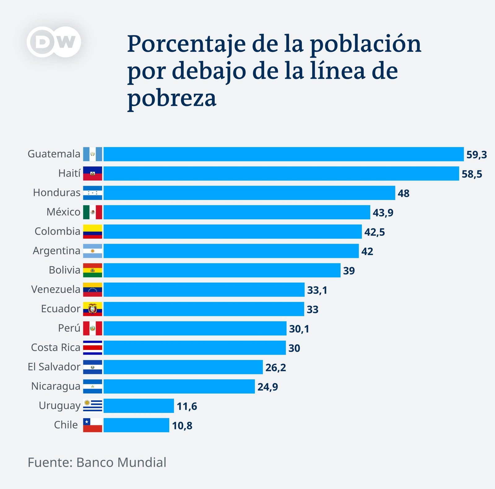 Todos estos aspectos nos dejan un mapa bastante desalentador en el presente. Revisemos en este gráfico, el porcentaje declarado por el banco mundial por debajo de la línea de pobreza.